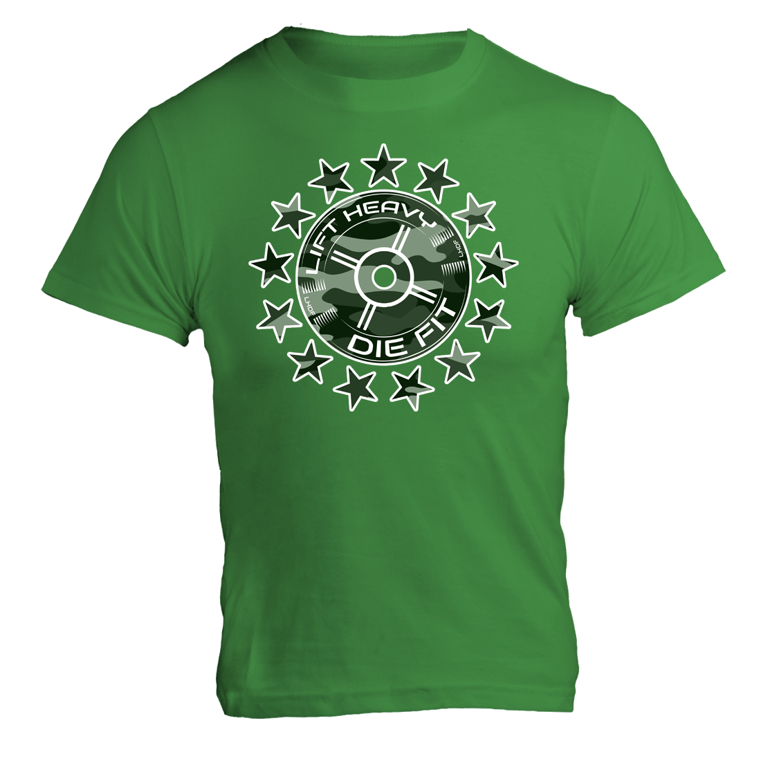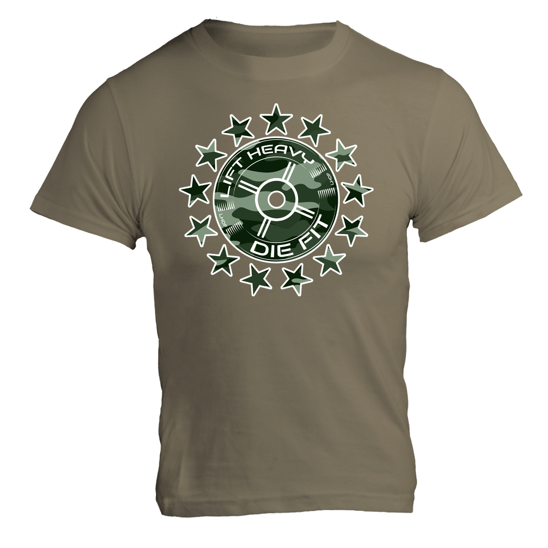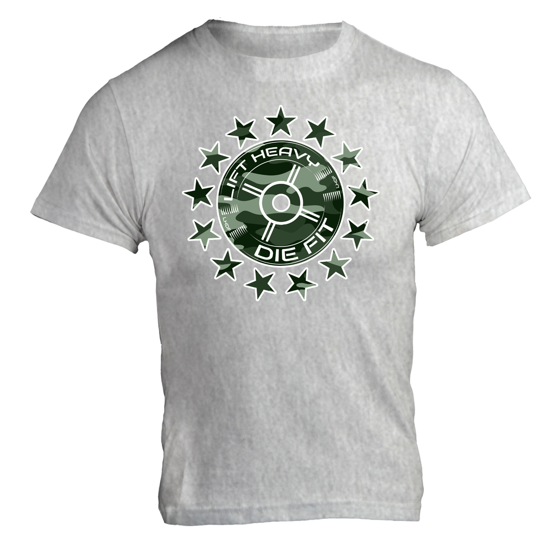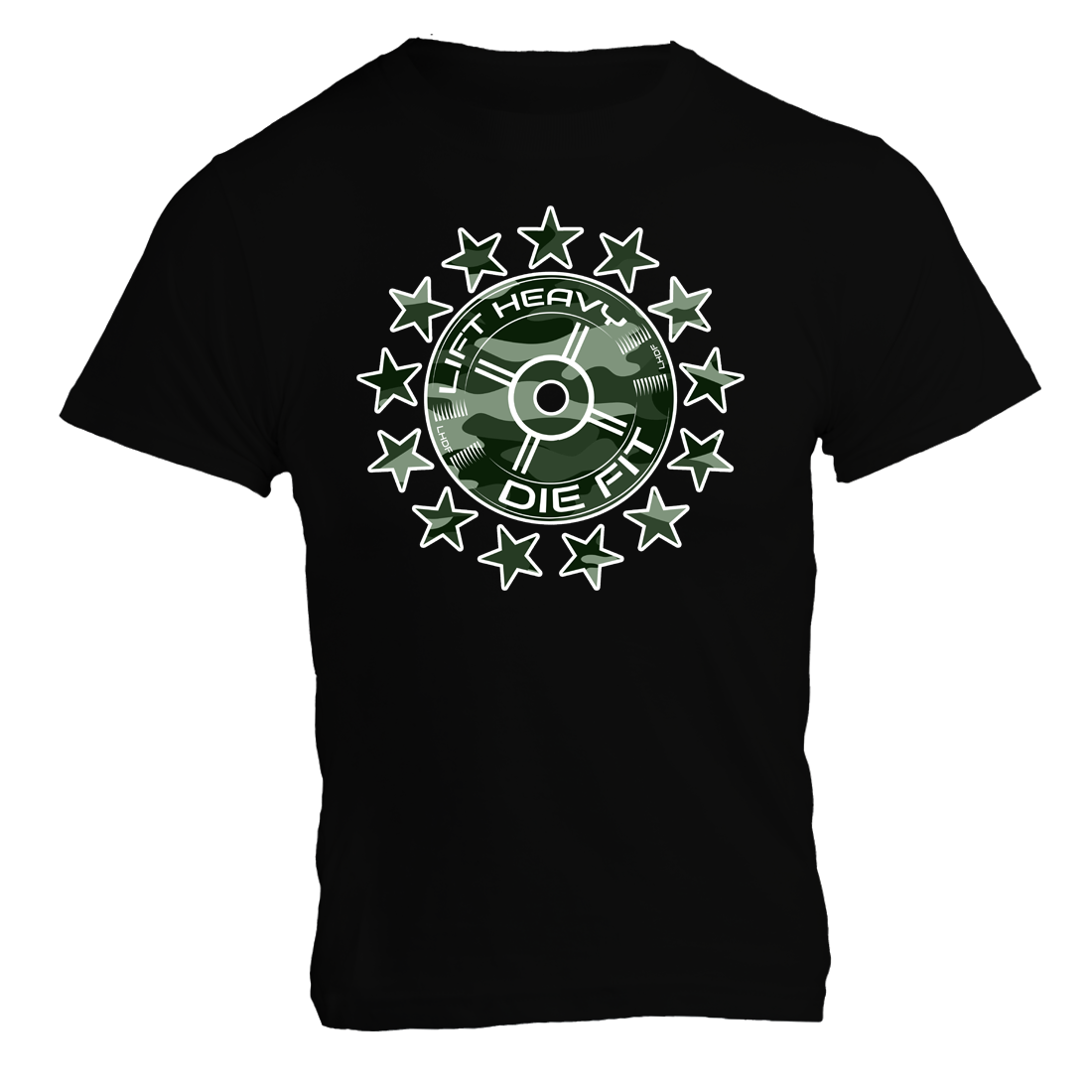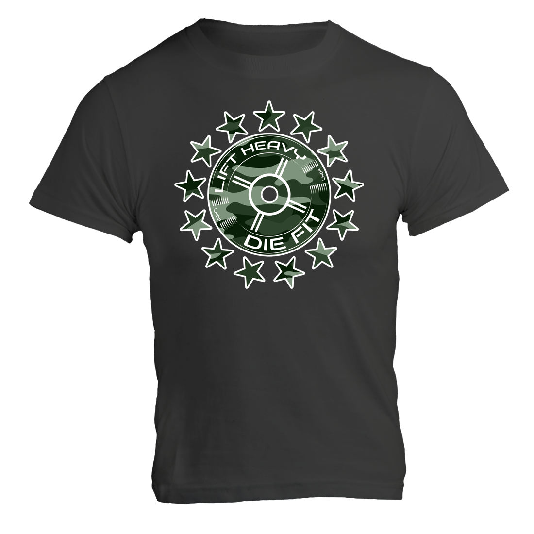 Unchain Your Strength with our Camo 45lb Plate and Stars Unisex Shirt - The Ultimate Fitness Apparel for Gym-Goers and Athletes