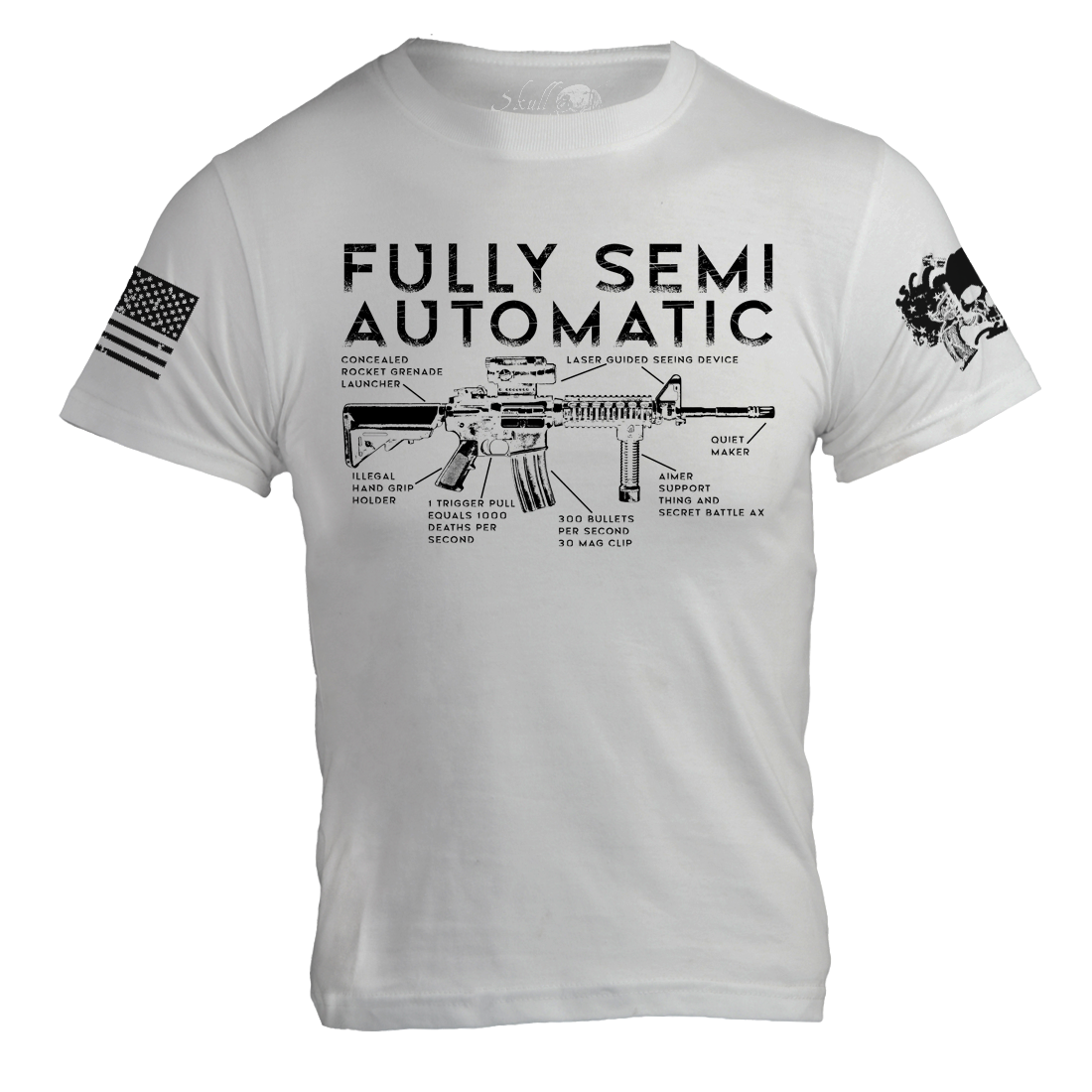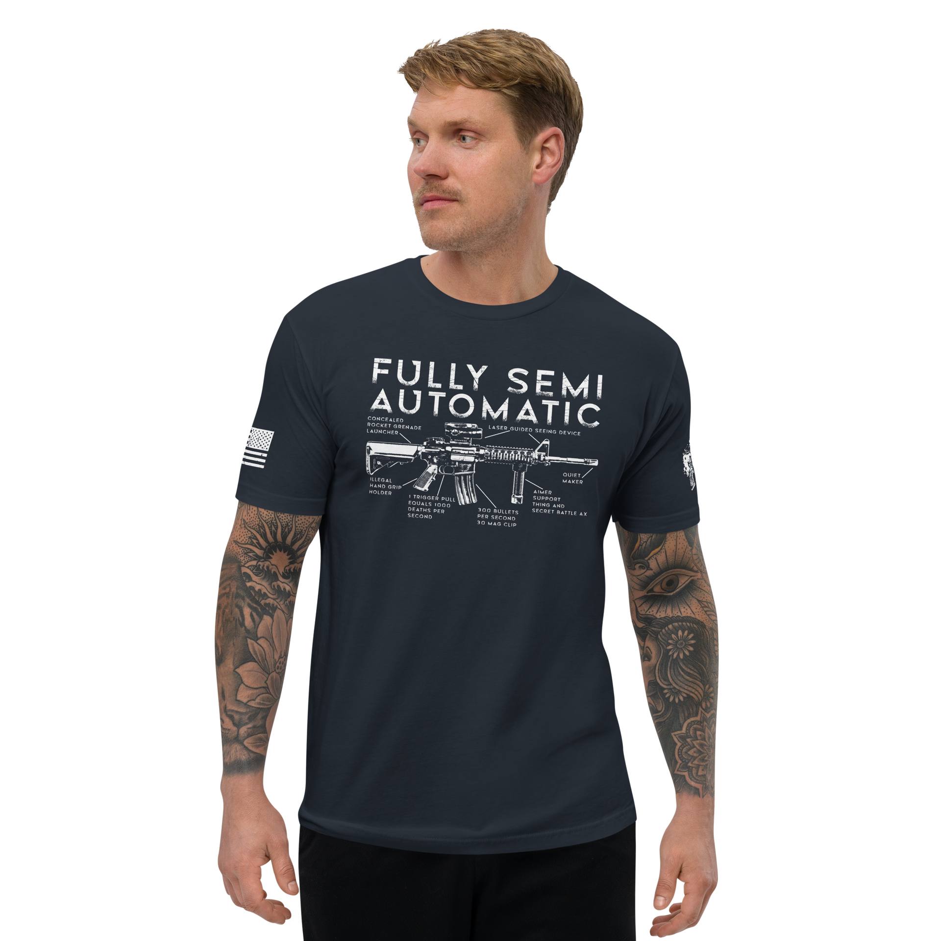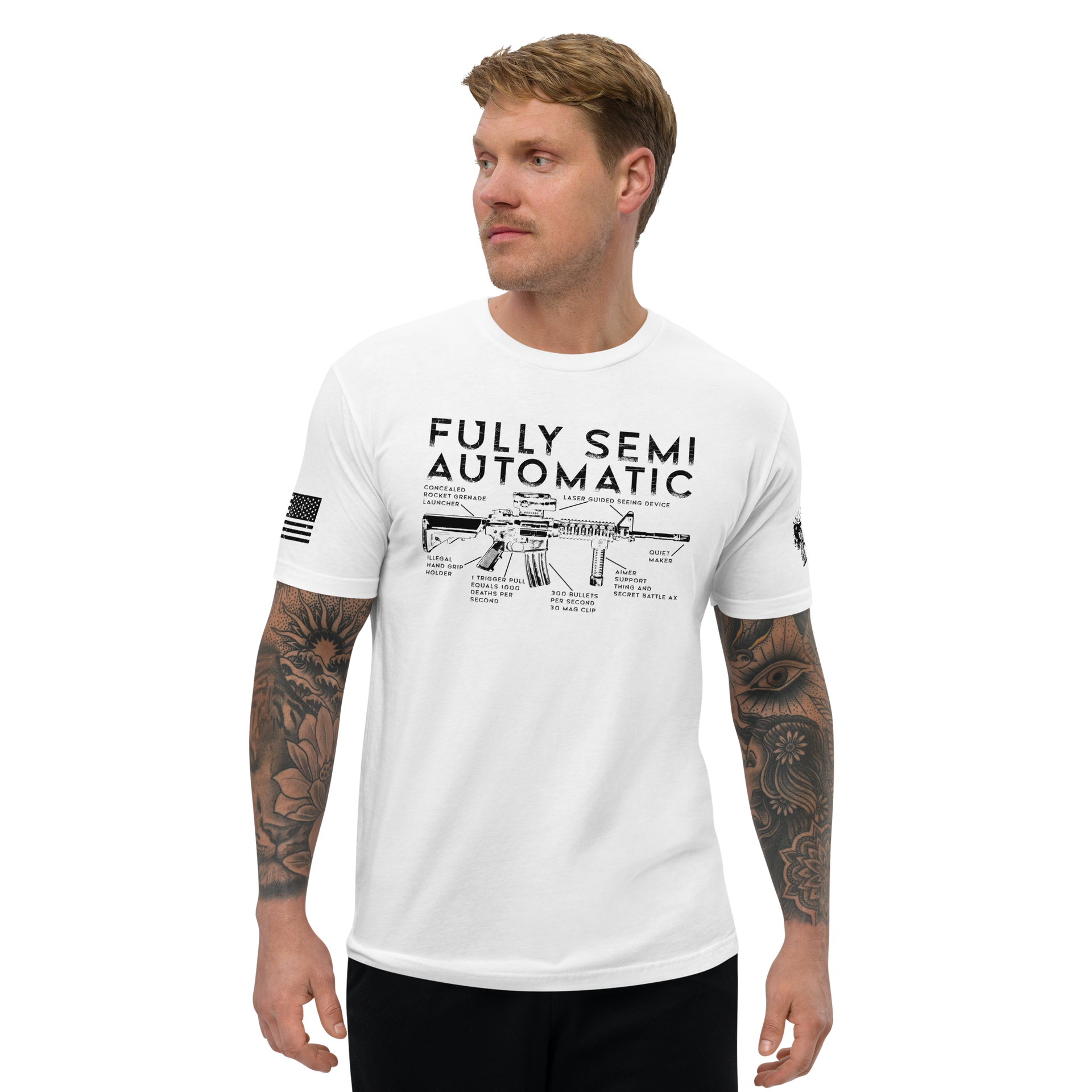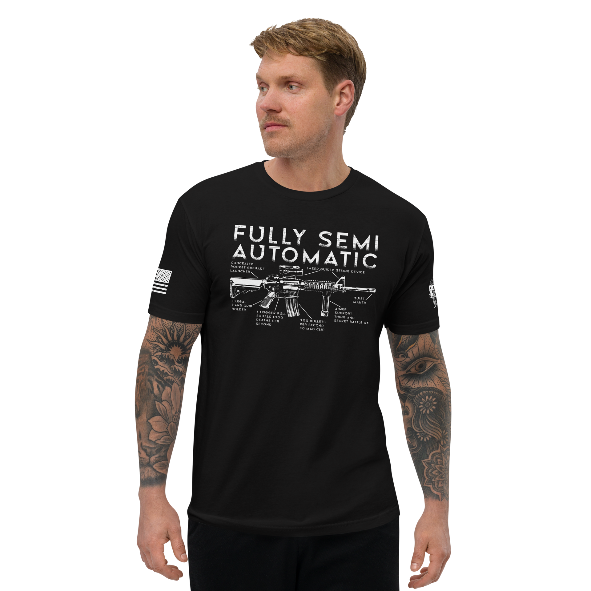Full Semi Automatic funny AR-15 Meme. If you know anything about firearms, you know there is no such thing, but the media likes to scare the uneducated with comedic rhetoric. This t-shirt is everything you've dreamed of and more. It feels soft and lightweight, with the right amount of stretch. It's comfortable and flattering for all.