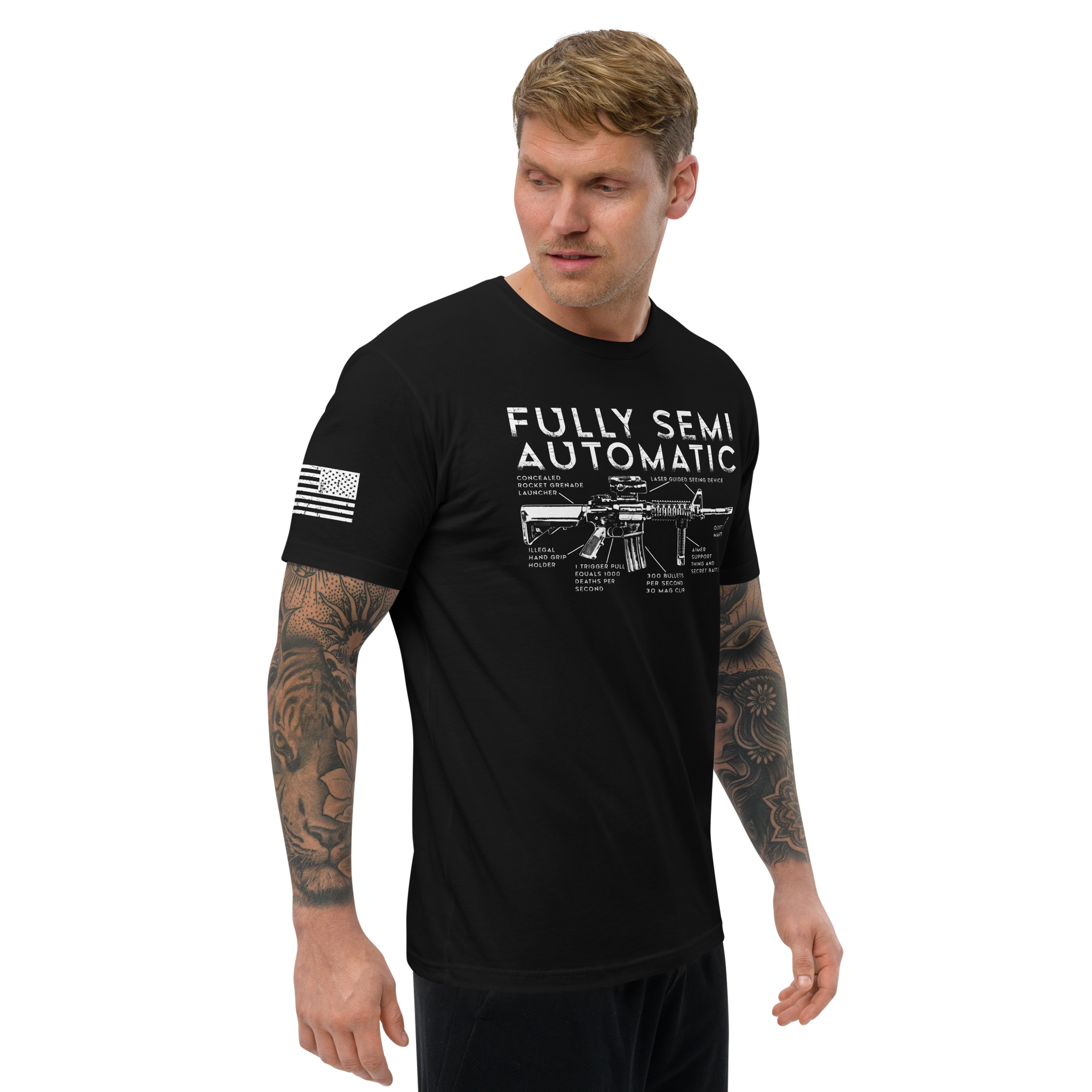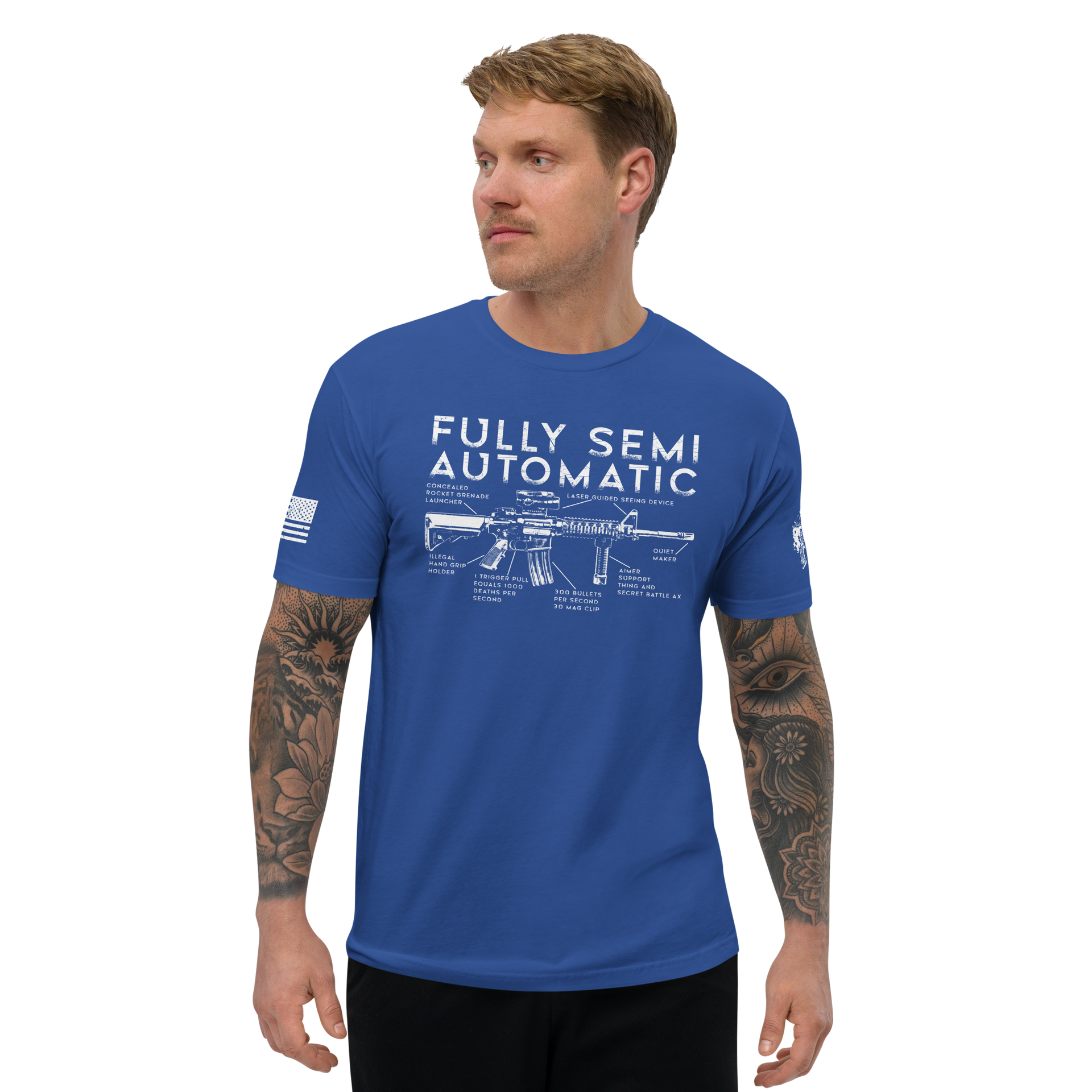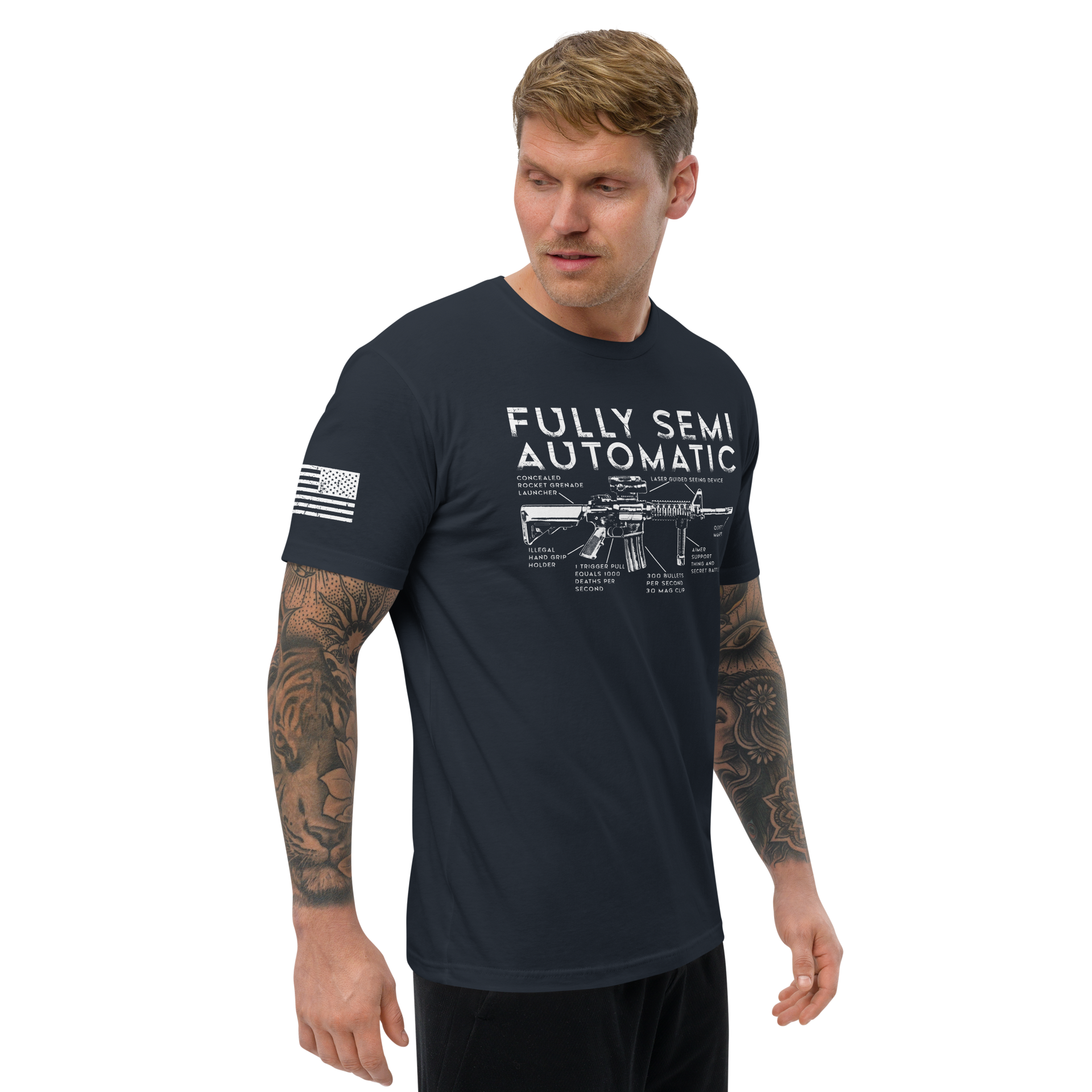 Full Semi Automatic funny AR-15 Meme. If you know anything about firearms, you know there is no such thing, but the media likes to scare the uneducated with comedic rhetoric. This t-shirt is everything you've dreamed of and more. It feels soft and lightweight, with the right amount of stretch. It's comfortable and flattering for all.