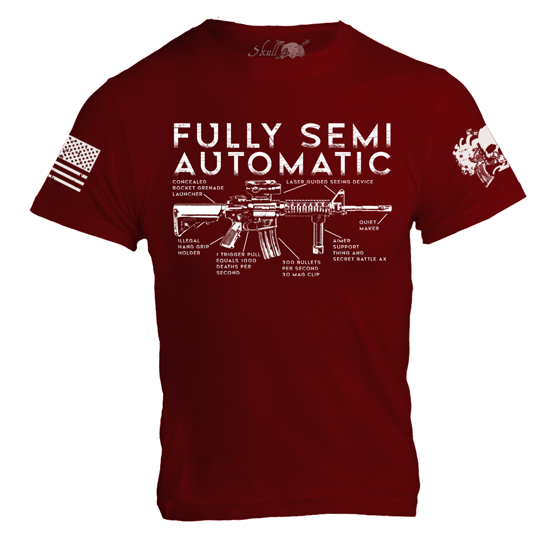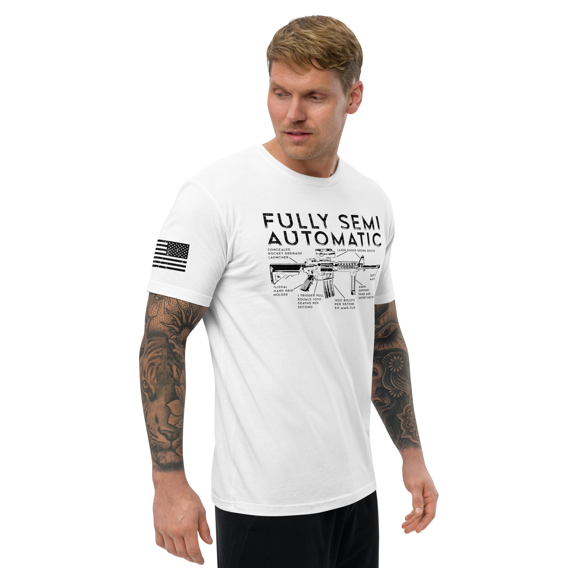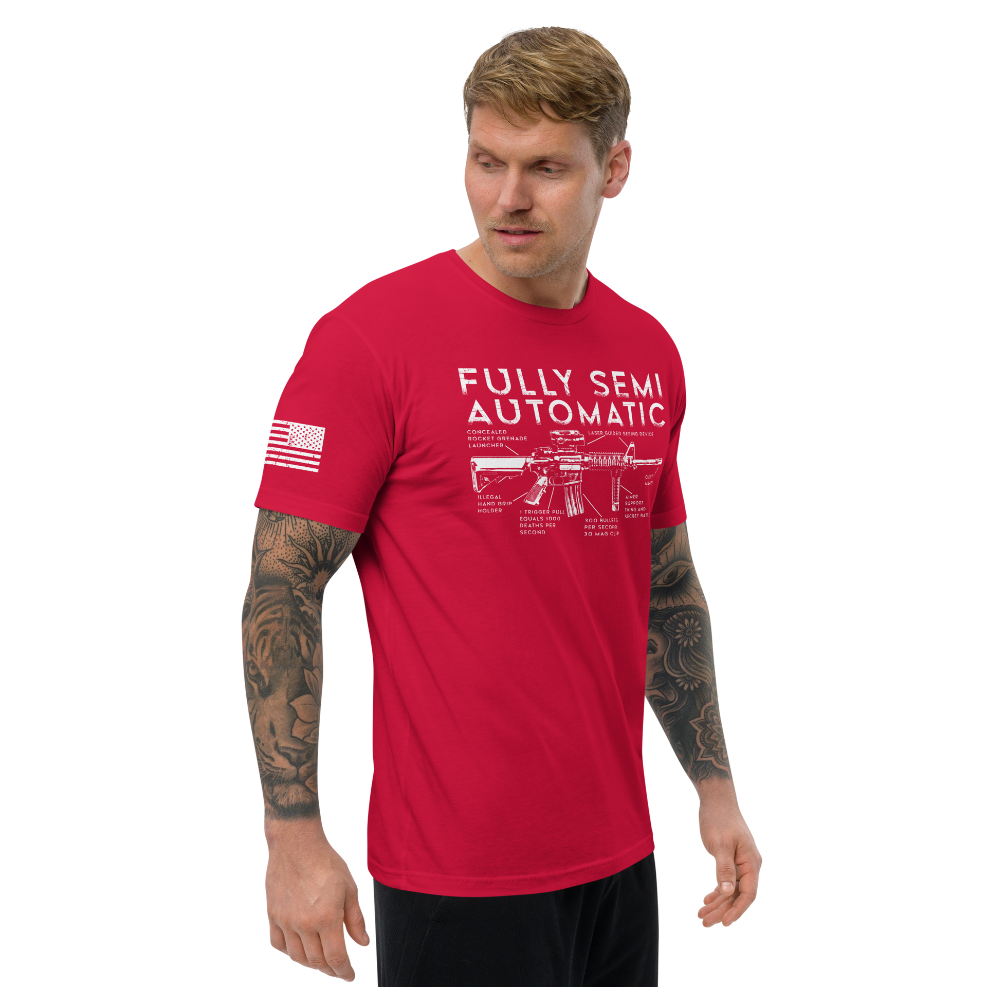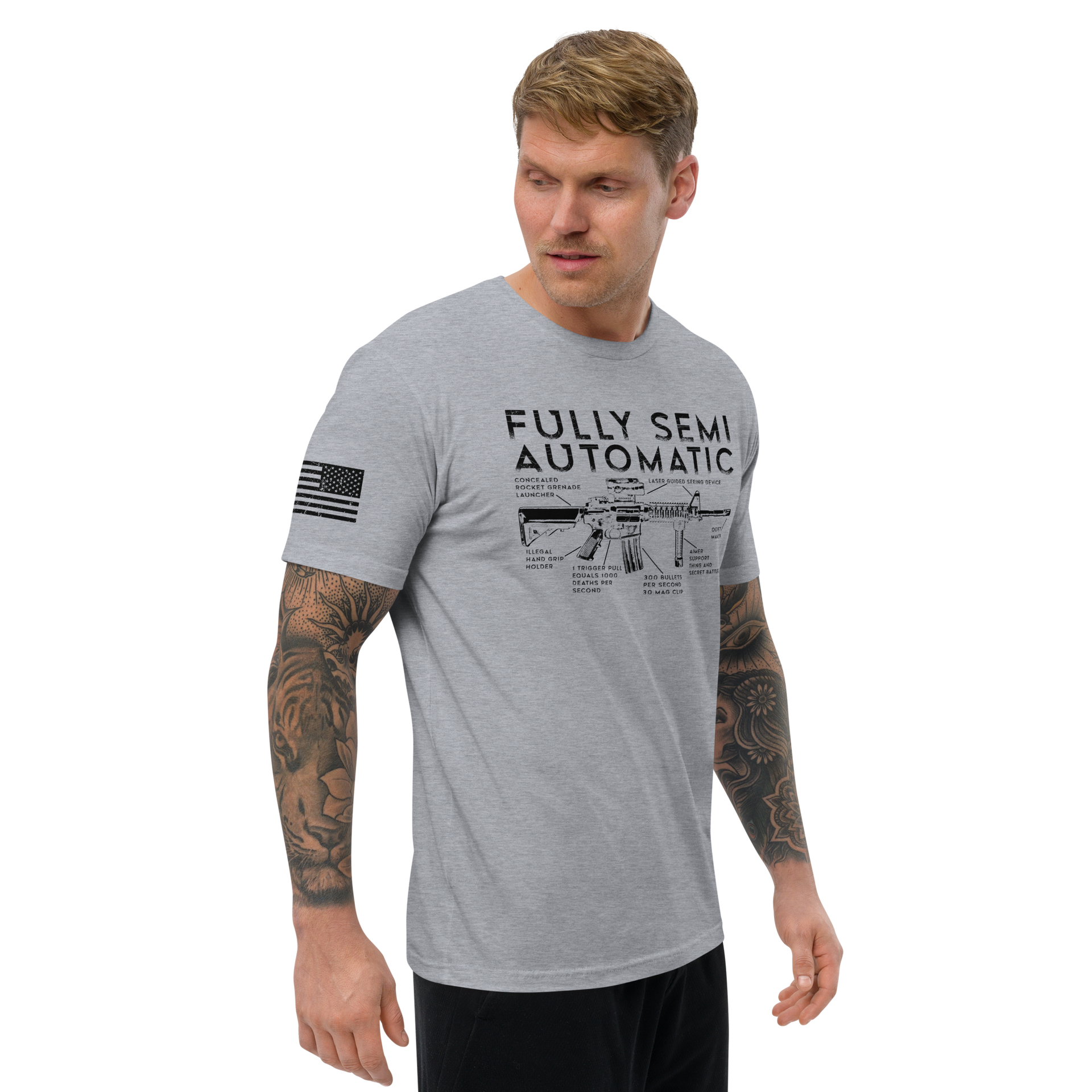 Full Semi Automatic funny AR-15 Meme. If you know anything about firearms, you know there is no such thing, but the media likes to scare the uneducated with comedic rhetoric. This t-shirt is everything you've dreamed of and more. It feels soft and lightweight, with the right amount of stretch. It's comfortable and flattering for all.