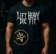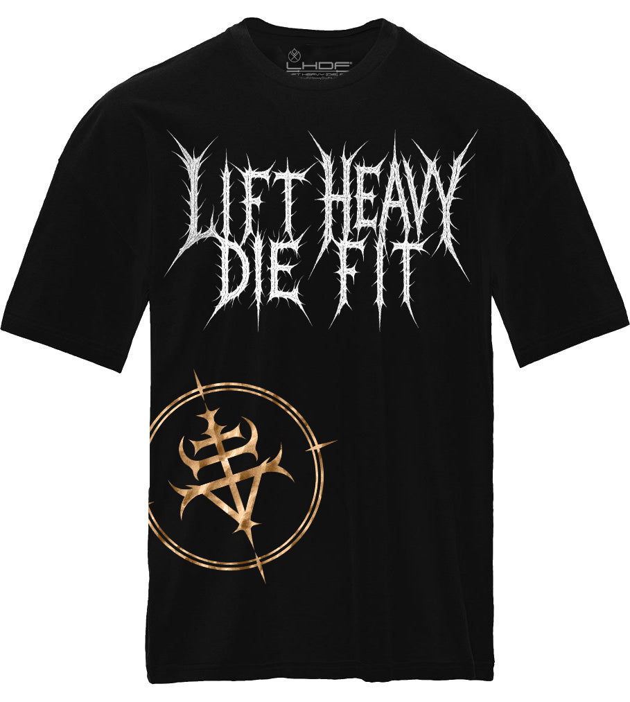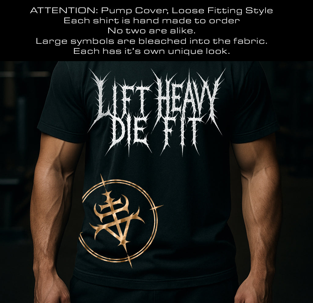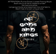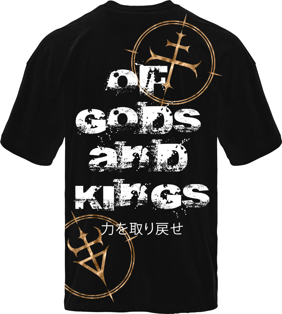 Featuring hand-bleached sigil markings, no two shirts are the same. Each one is scorched with intent—etched with symbols of strength, rebellion, and ascension. The bold lettering reads “OF GODS AND KINGS” and “LIFT HEAVY DIE FIT” in distressed fonts inspired by metalcore and underground gym culture. Japanese kanji on the back translates to: “Reclaim your power.”
