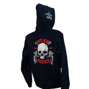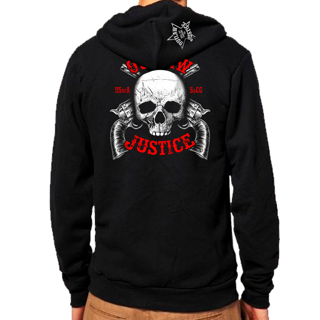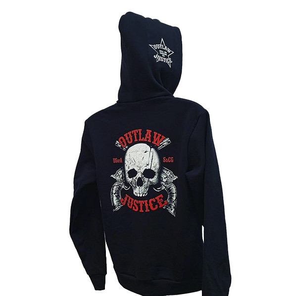 - Back - Large Skull and Crossguns logo with text "Outlaw Justice"